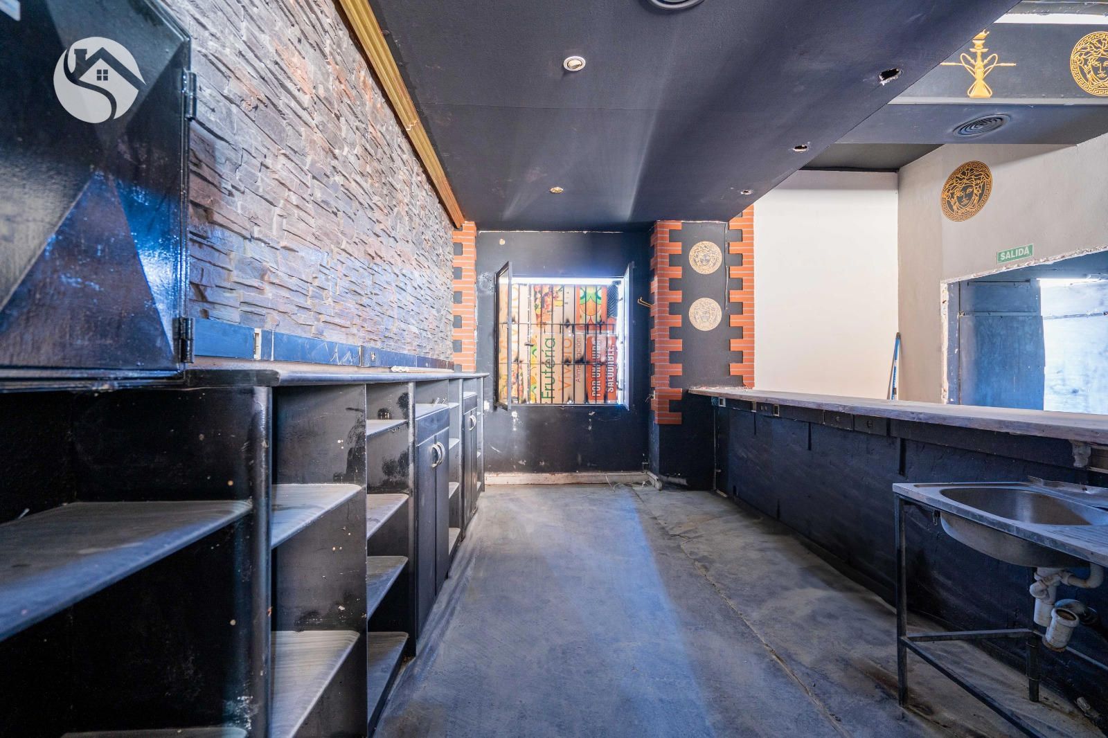 Tiene dos baños, barra y almacén.